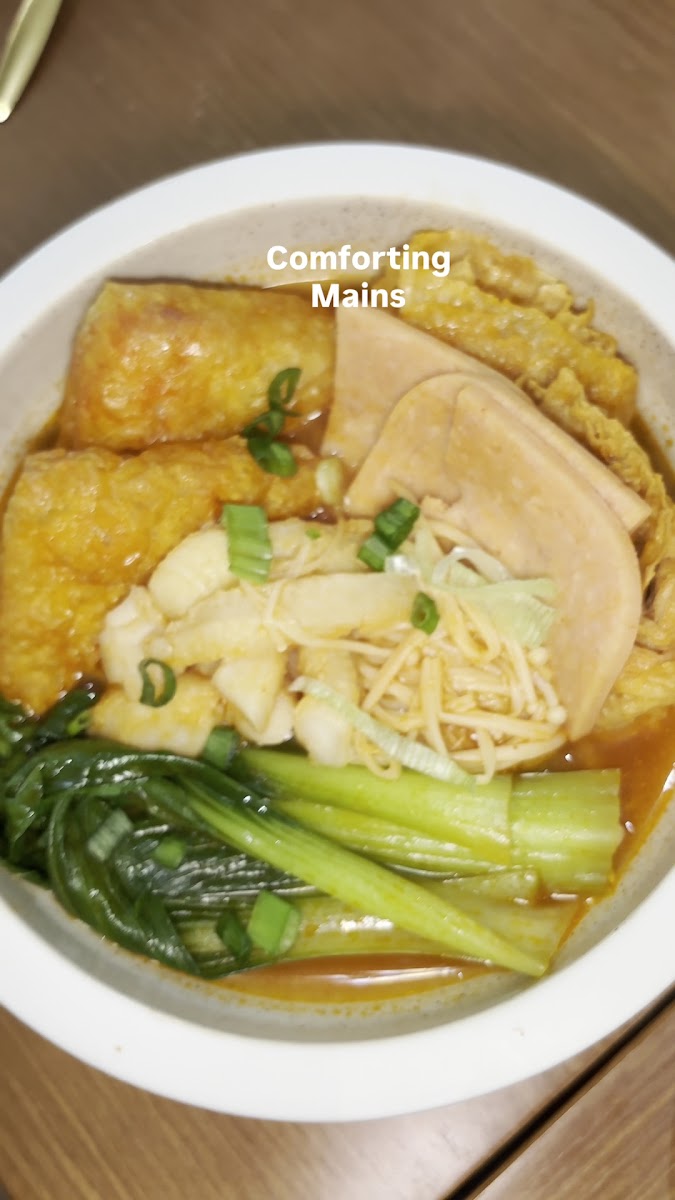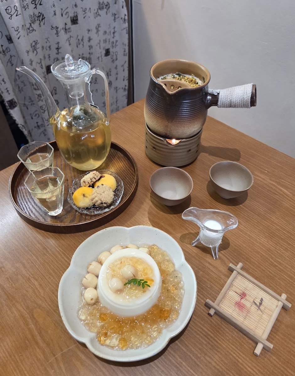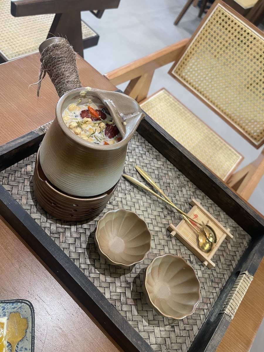 Definitely a really zen place! Comfortable place to chill with friends over food or dessert! They serve both mains, drinks and dessert! Would definitely recommend you guys to try their newly launched menu! We love the creamy mala rice noodles as well as the tomato one! They have vegetarian friendly mains like the mock chicken curry which goes well with rice! Their claypot tea is so good! LOVE IT! So fragrant for the rose pu-er that we tried! For the dessert would strongly recommend the taro mochi! We tried the soufflé and was pretty good too!