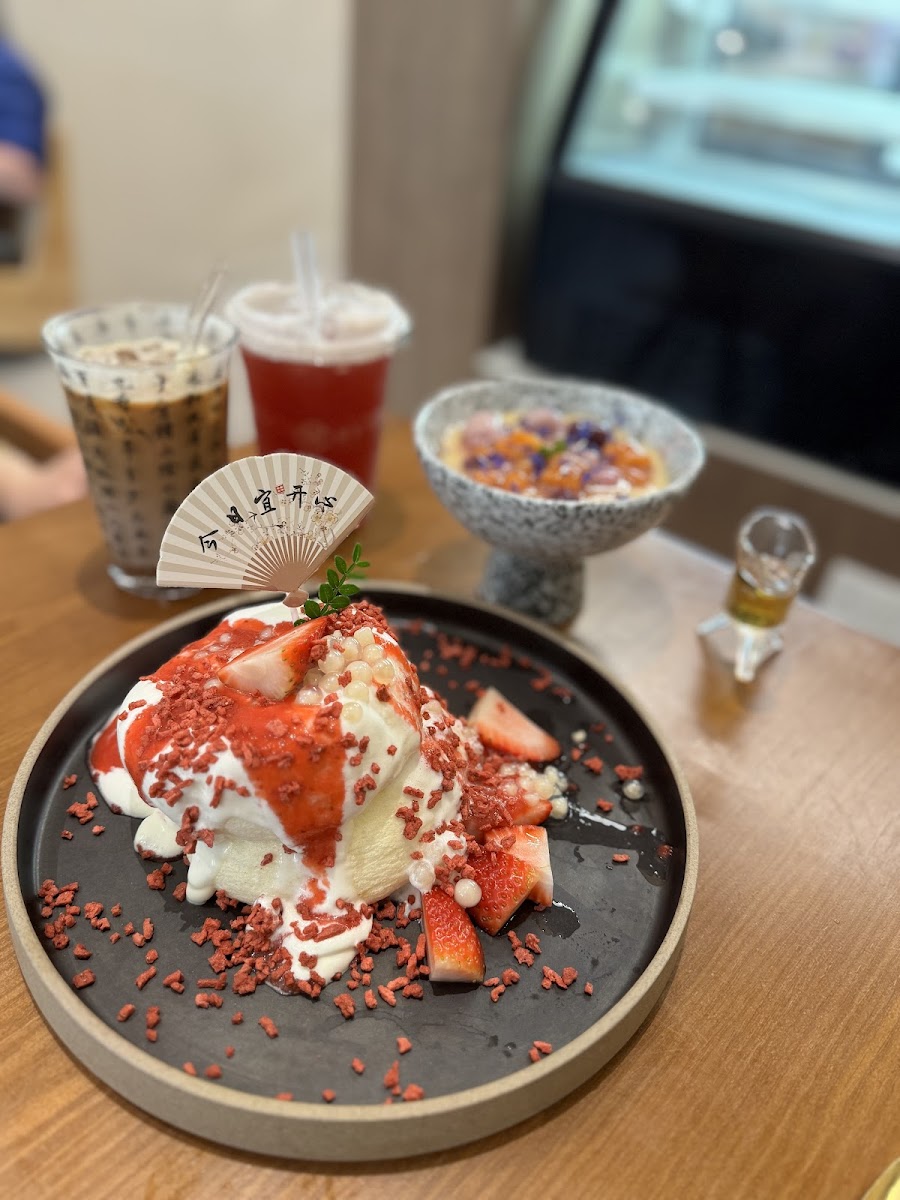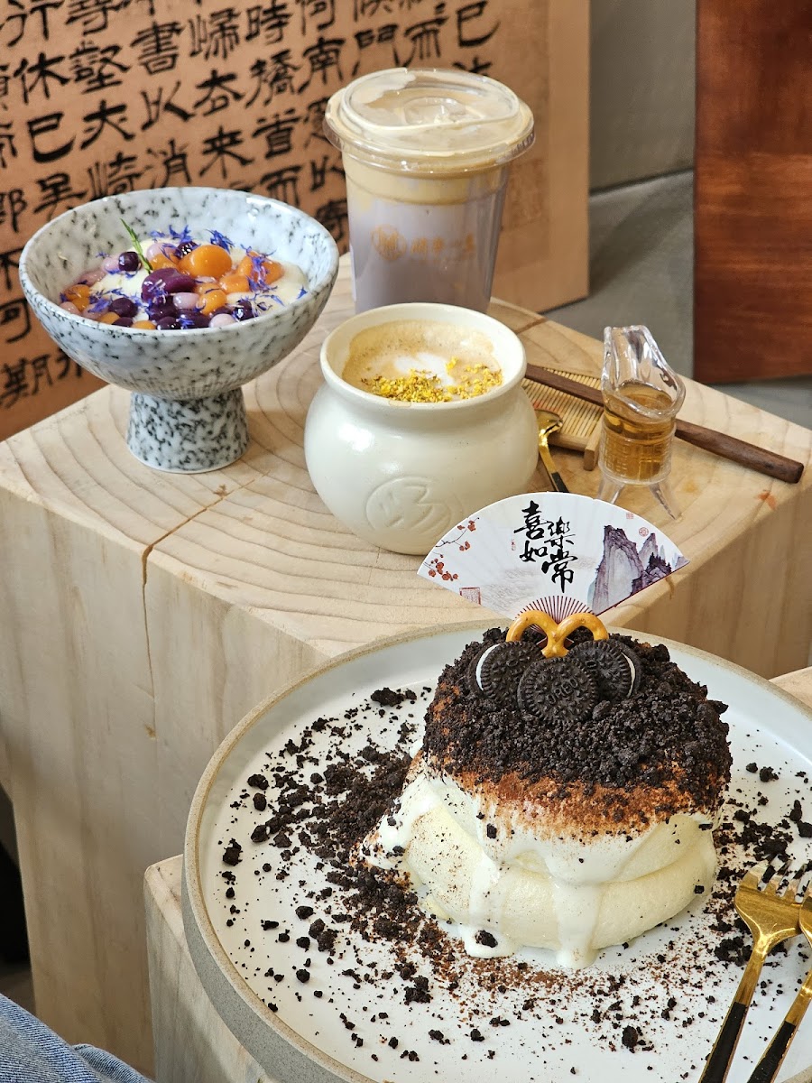 WAH! I love the vibe and interior design here very chill dessert cafe, the menu are very interesting especially the milk tea! We ordered Taro Mochi, Mango Soufflé Pancake, Rose Roasted Milk Tea and White Peach Oolong Milk Tea. We enjoyed all everything and we will come back for more because they have many other options Can’t wait to come back here again! It is definitely worth the try if you are into Chinese and warm dessert